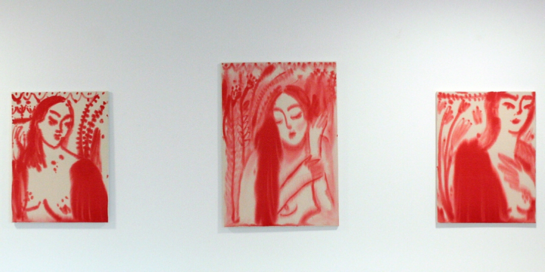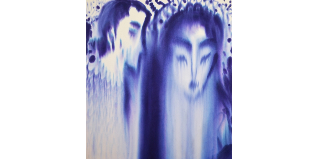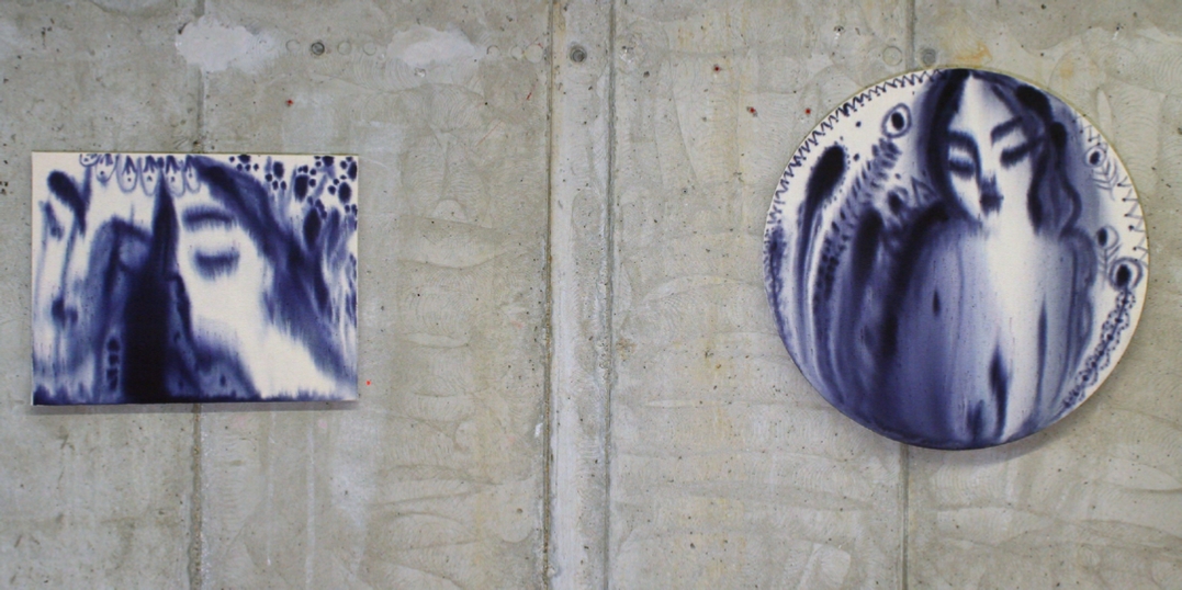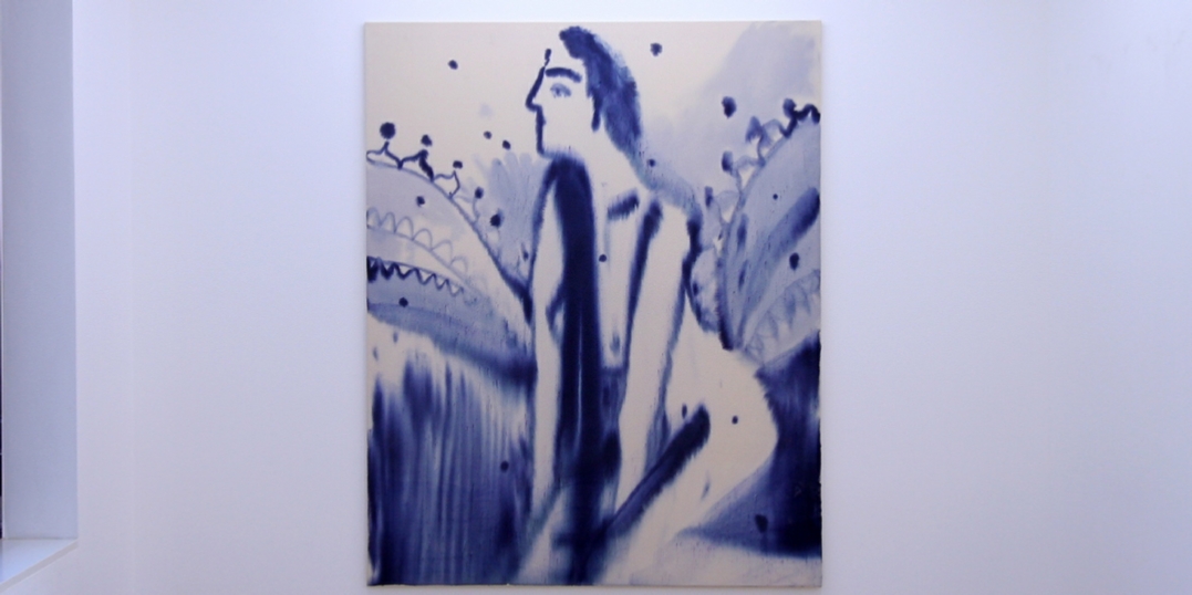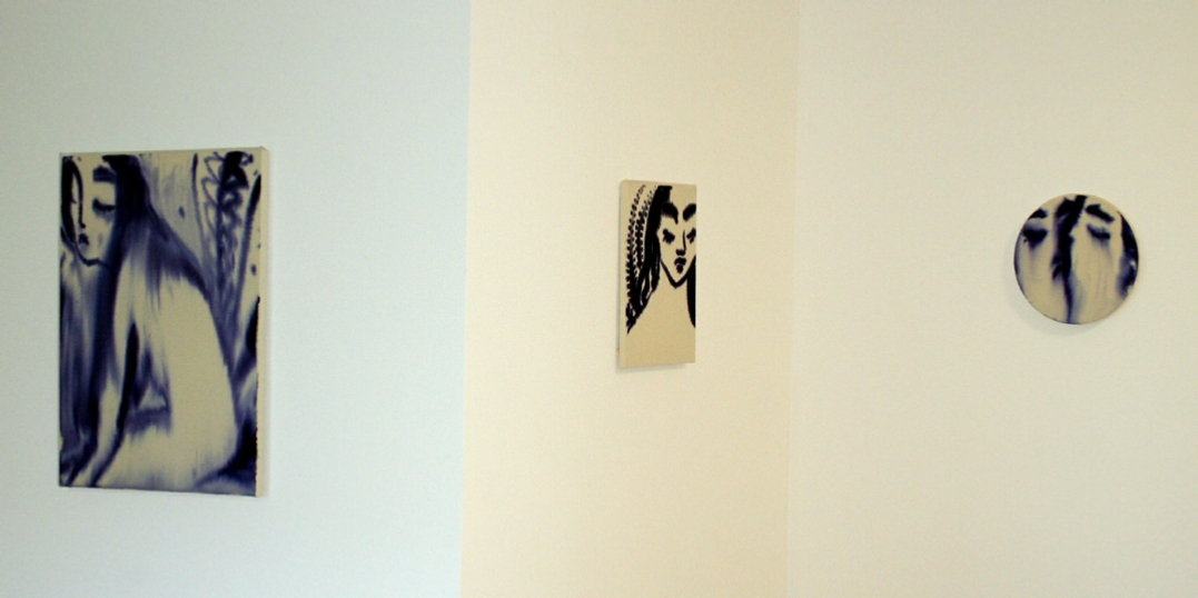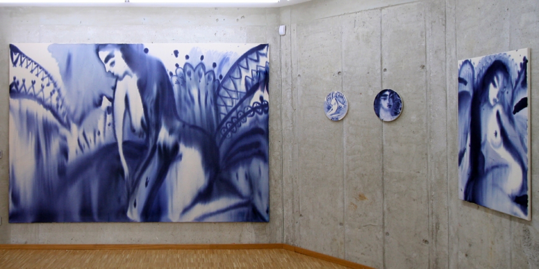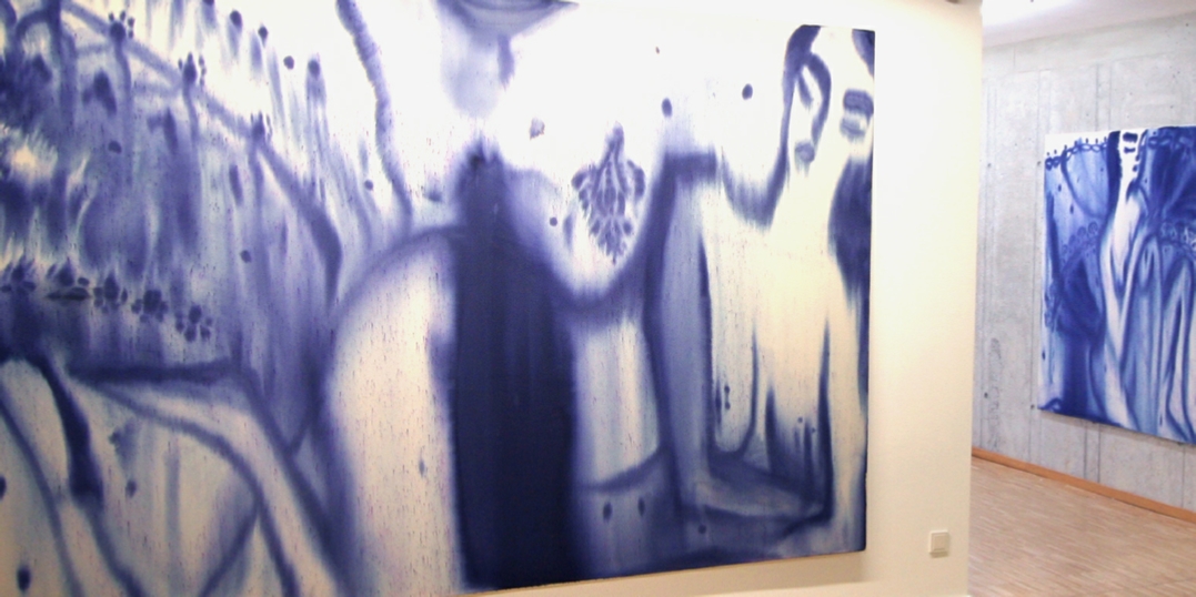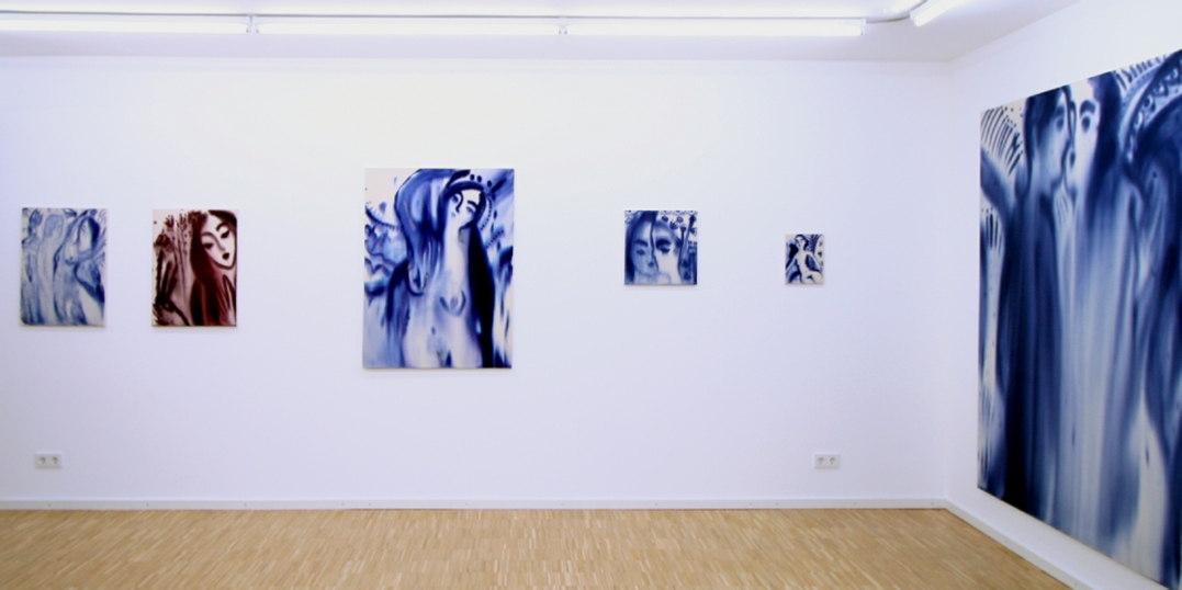 For Katharina Stangler Indigo is at the center of her painterly interest. Most of her works are done in indigo, which distinguishes in a softly even pronounced way from the opaque whitish tones of the background of the unprepaired canvas. This particular color combination is highly reminiscent of Chinese porcelain painting as well as the well-known Portuguese Azulejo tiles. Katharina Stangler deliberately does not use the original pure pigments, instead she prefers indigo as a mixed combination out of magenta-, cyan- and black pigments. Due to the different weight densities of the individual pigment particles, the former master student of Andreas Schulze achieves an uneven distribution of the three colors after wetening the Canvas with large amounts of water. The result is highly influenced by random distribution of the color particles creating iridescent color mixtures and subtle transitions between sometimes more blackish, sometimes more violet shades of blue. As in watercolor painting, the color blurs diffusely at the edges of brush strokes, soaks into the cotton and blossoms along the fibers in fine ramifications. By this, every line and every shape is continuously broken in its contour. The figures, seemingly expressive and painted with ease gesture, are set in motion with such intensity and perceived by the viewer as a vibrant silhouette. Mostly women are portrayed - alone with madonna-like delicacy or in a gentle physical encounter with a male partner - shy, naked and vulnerabe, in an environment of floral and ornamental elements. Often, the motives are reminiscent of works by Ernst Ludwig Kirchner or Otto Müller. They carry this restrained, almost lofty grace, which may be called natural beauty. The idyllic nature of her paintings rouses from the familiarity with the moment that the viewer feels reminded of. The moment of the "Blue Hour", this brief period of dusk after the setting of the sun until the entrance of nocturnal darkness, whose mystical light mood evokes both, romantic and genuine feelings. With this she addresses the yearning for peace, security and peace in our fast-paced world.